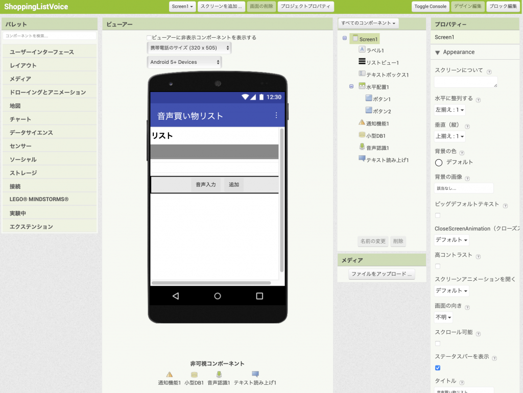 非可視コンポーネントとしてユーザーインターフェース パレットから通知機能コンポーネント(通知機能1)を1つ、メディア パレットから音声認識コンポーネント(音声認識1) とテキスト読み上げ コンポーネント(テキスト読み上げ1)を、ストレージ パレットから小型DBコンポーネント(小型DB1)を1つ追加します。