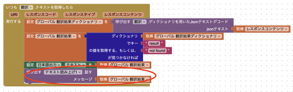 - ブロック編集:テキスト読み上げ.話す 呼び出すブロックを追加
