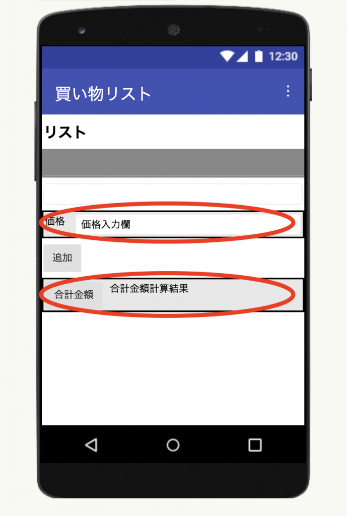 - デザイン編集:テキストボックス(価格入力欄)、ボタンとラベル(合計金額)を追加